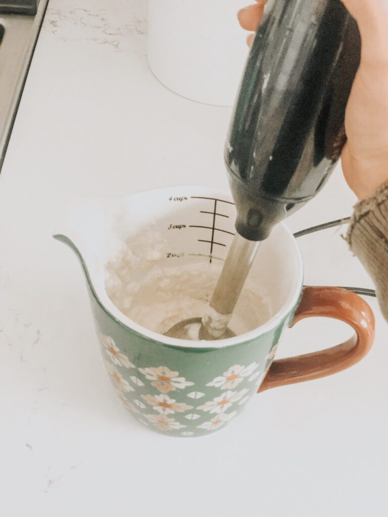 - Place all ingredients except coffee into a measuring cup. The only thing that gave me that cloud consistency was my immersion blender. Hold it at a 45 degree angle and blend until you get a thick consistency (that’s that heavenly goodness!)