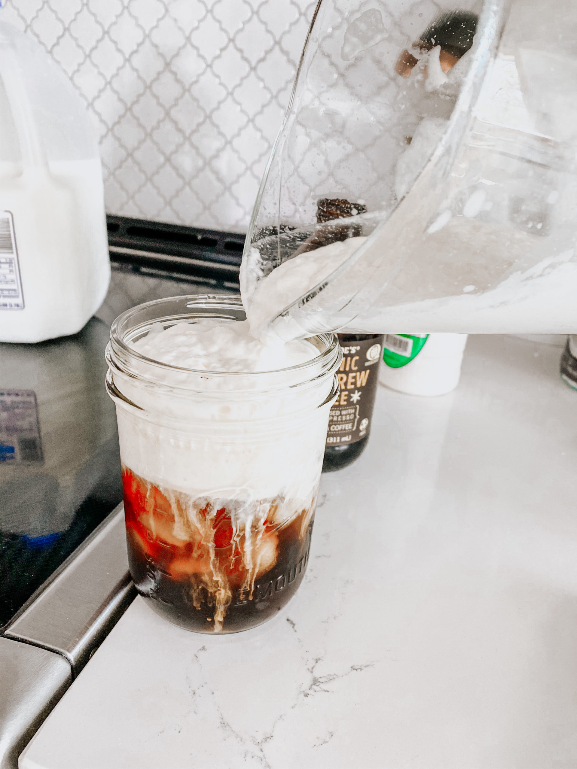 Fill a glass with ice and pour your cold brew or iced coffee about ¾ of the way full. - Top with foam