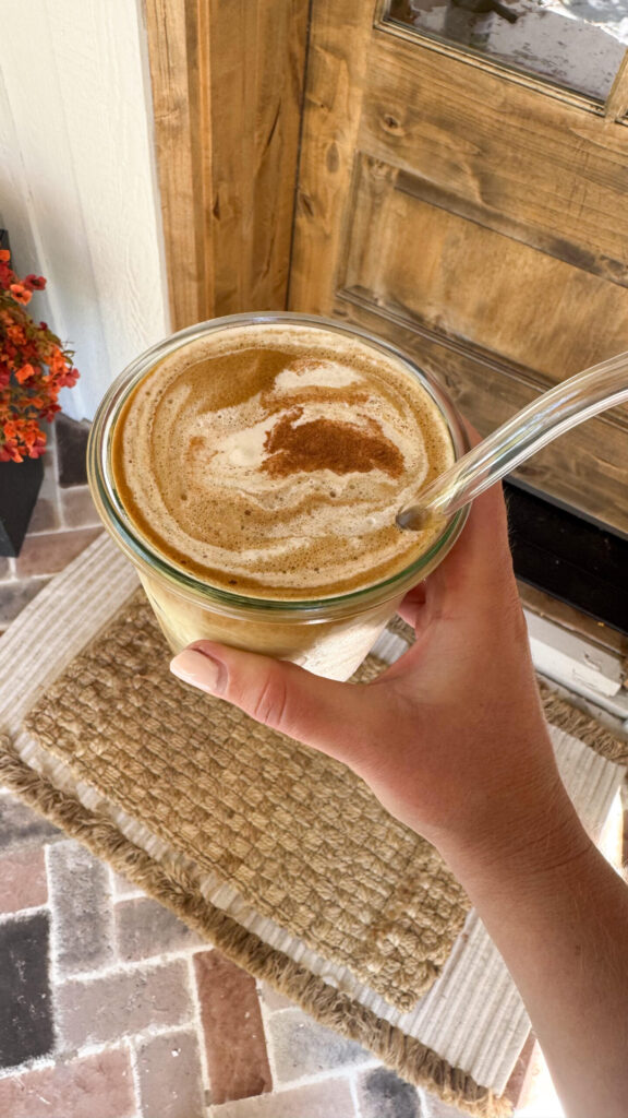 Slowly pour the creamy pumpkin mixture on top of your iced coffee for a layered effect. Sprinkle with cinnamon, pop in a straw, and enjoy! Link to my favorite cinnamon duster.