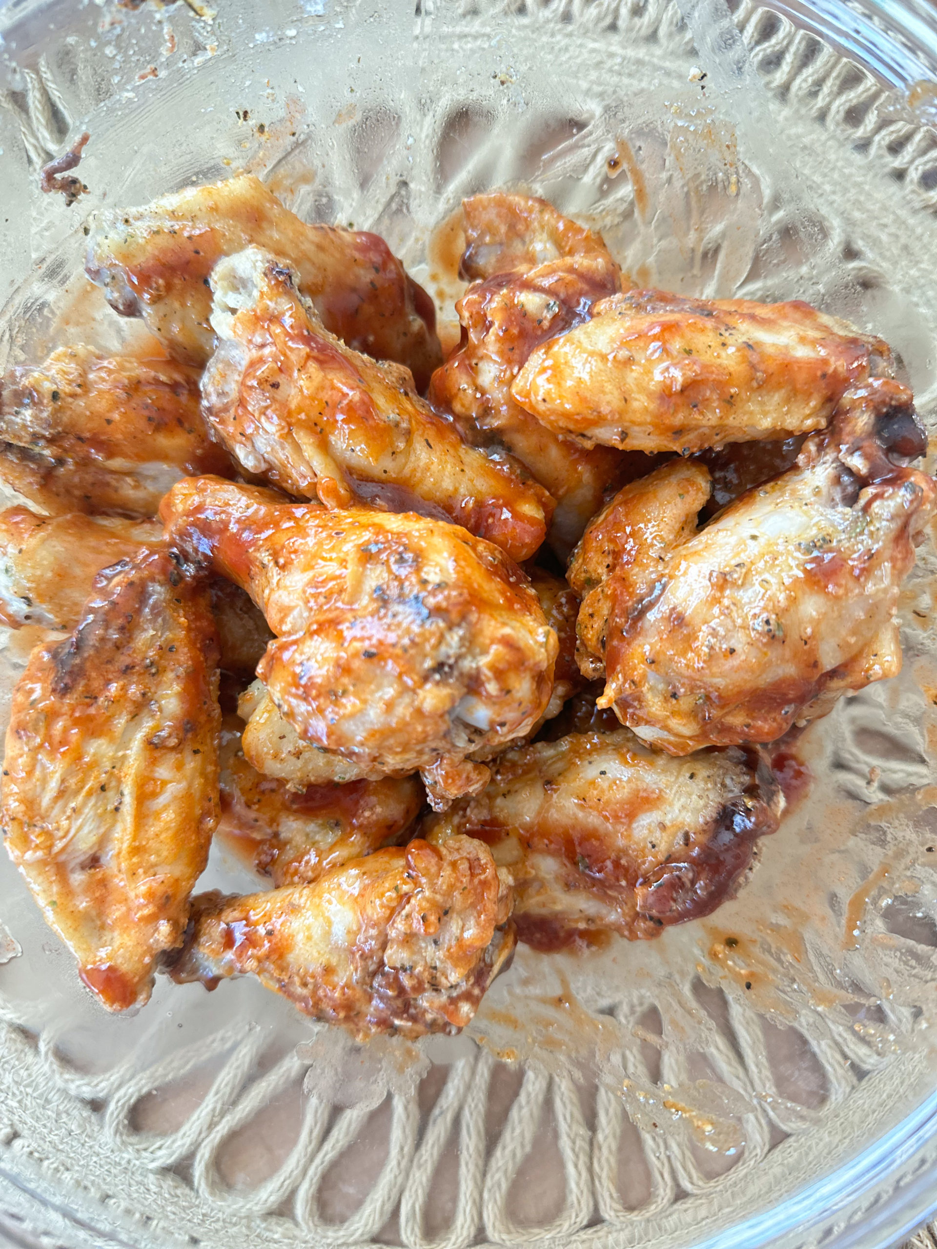 Toss wings in sauce after they’re fully crisped. Adding sauce before air frying will soften the skin.