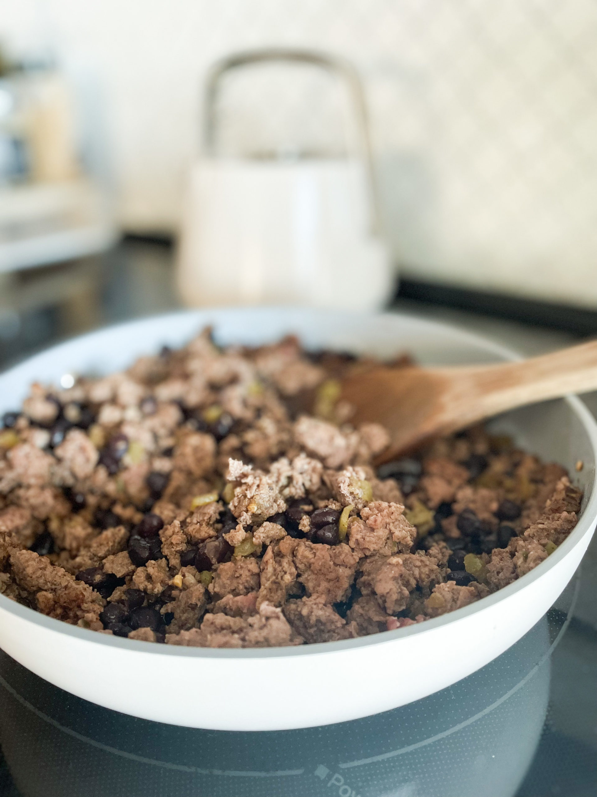 - Start by cooking up your ground beef in a pan. Add in the taco seasoning, onion powder and garlic salt. Once cooked, add in the chilies and black beans and cook for a few minutes.