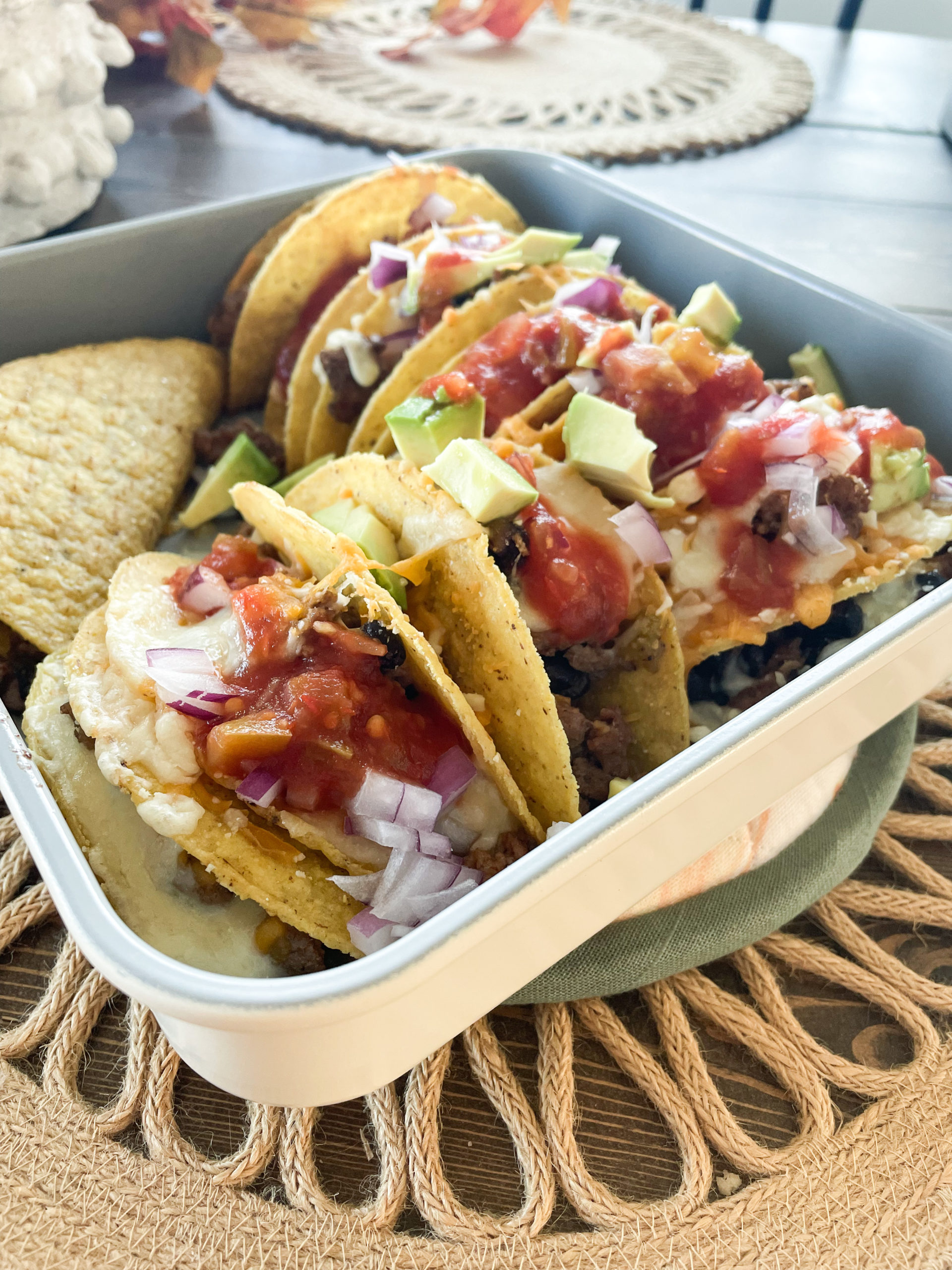 Back with another easy taco Tuesday night meal for you! These baked beef tacos are so delicious and under 30 minutes! If you're not a fan of beef you can easily switch it up with shredded chicken or just beans and cheese!