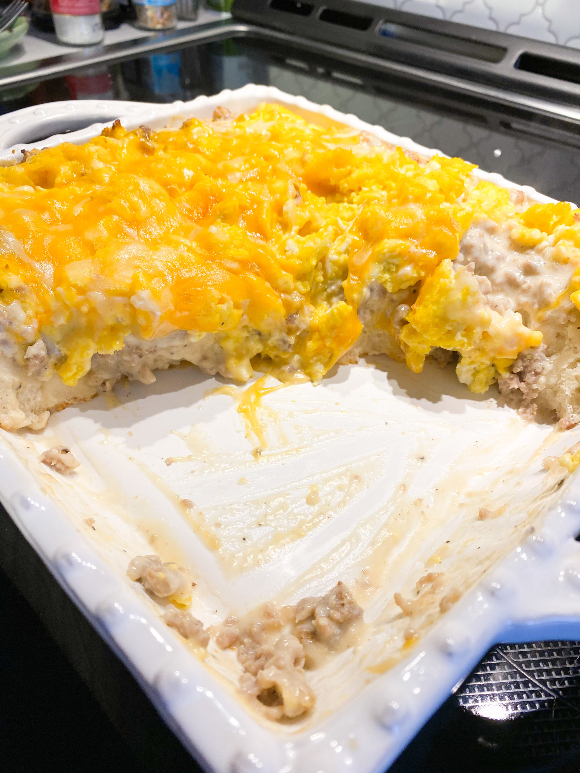 - Grease a 10x10 casserole dish and break your biscuits into pieces and place in the casserole dish. Pour the sausage gravy on top. Place scrambled eggs on top and top with cheese.