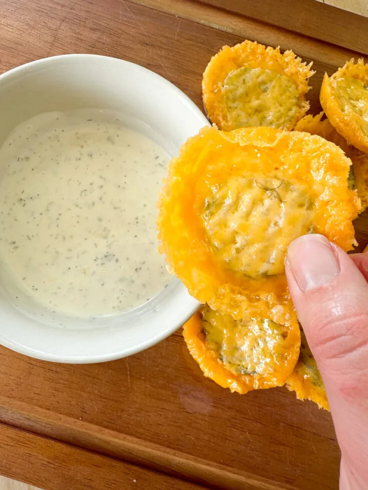 - Next, place your fill pickles on a paper towel and pay dry. Add a dill pickle slice on top of the cheese and cover with more cheese. Bake at 400° for 9 to 12 minutes or until the edges start to brown.