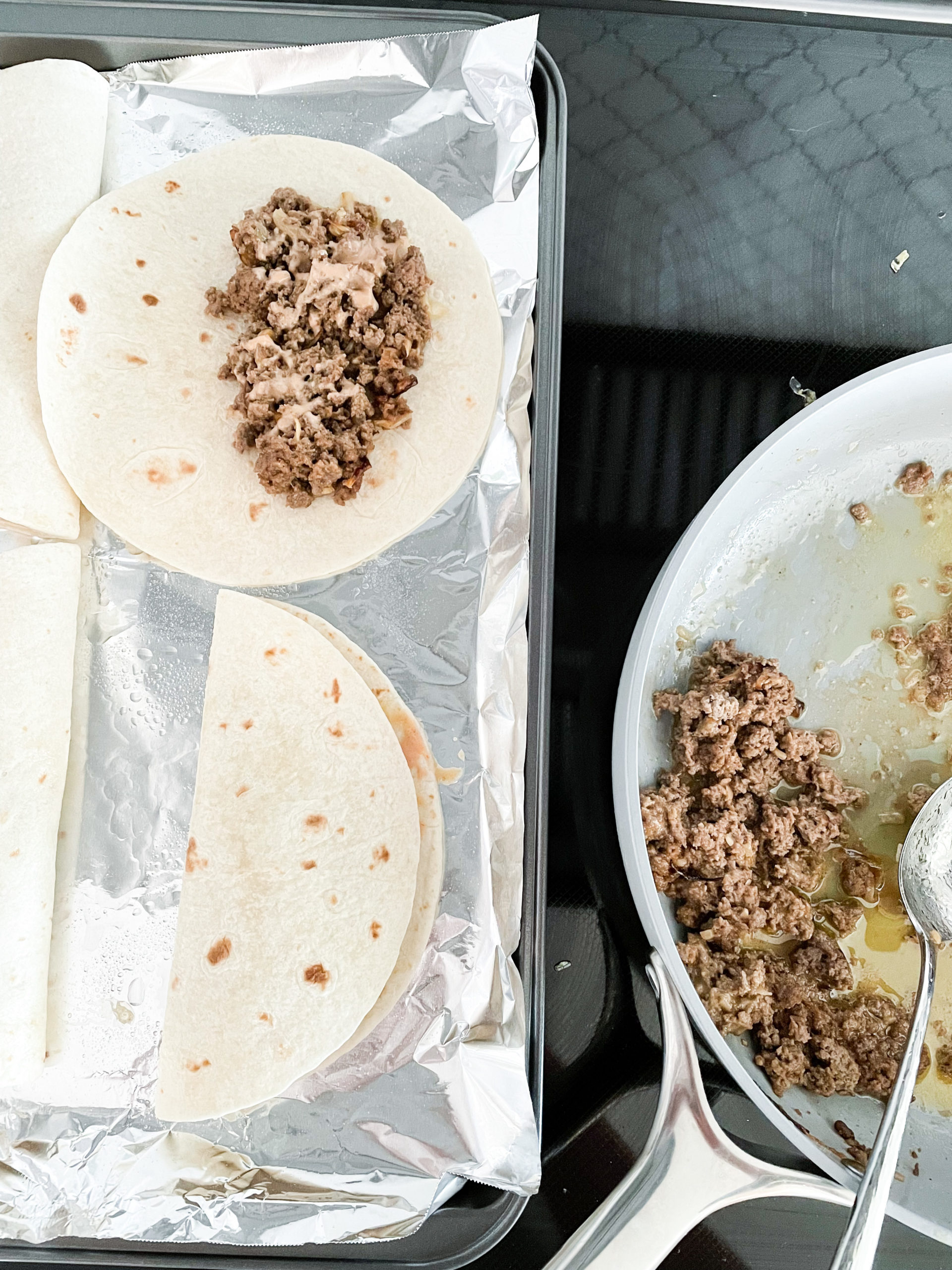 - Preheat oven to 350 and spray a pan with olive oil. Place your tortillas on the pan and spoon about 1/4 cup of the meat mixture on each tortilla (should be 5-6 total), drizzle the fry sauce on top of the meat mixture, fold in half and place on pan. Spray the tops of the tortillas with olive oil and bake for 15 minutes.