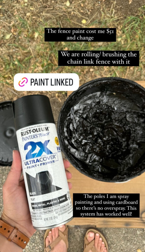 I used asphalt fence paint and applied it with a nappy roller. The thicker roller helps push paint into all the twists and turns of the chain link without too much effort.