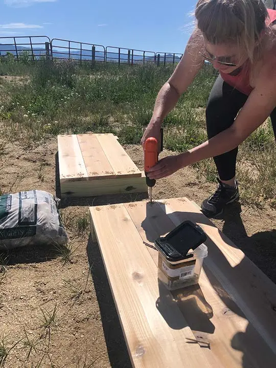 Make sure your boards are even and the 4×4 is even with the ends of the board. Start with your top board, drill your holes first, this prevents splitting, then drill in your screws. I use 2 screws on each side of the boards.