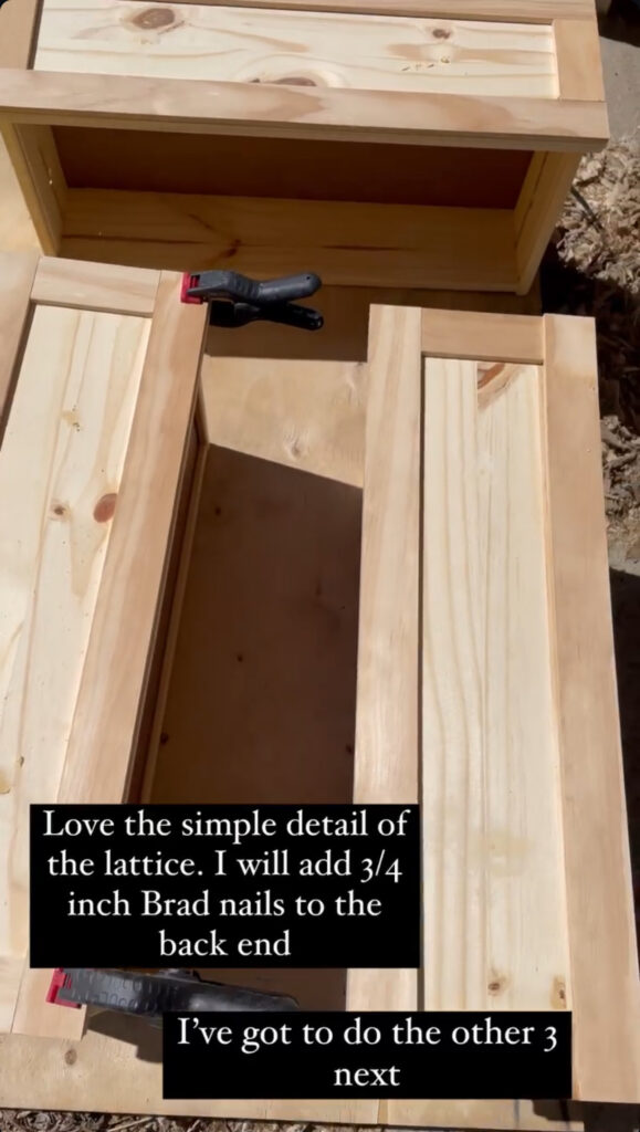 Next, I measured and cut lattice trim strips to create a custom frame on each drawer front. This instantly adds a finished, elevated look. To attach the trim, I used wood glue and secured it with 3/4″ Brad nails along the sides. Bonus: the trim also covers the screw holes on the drawer fronts for a seamless look.