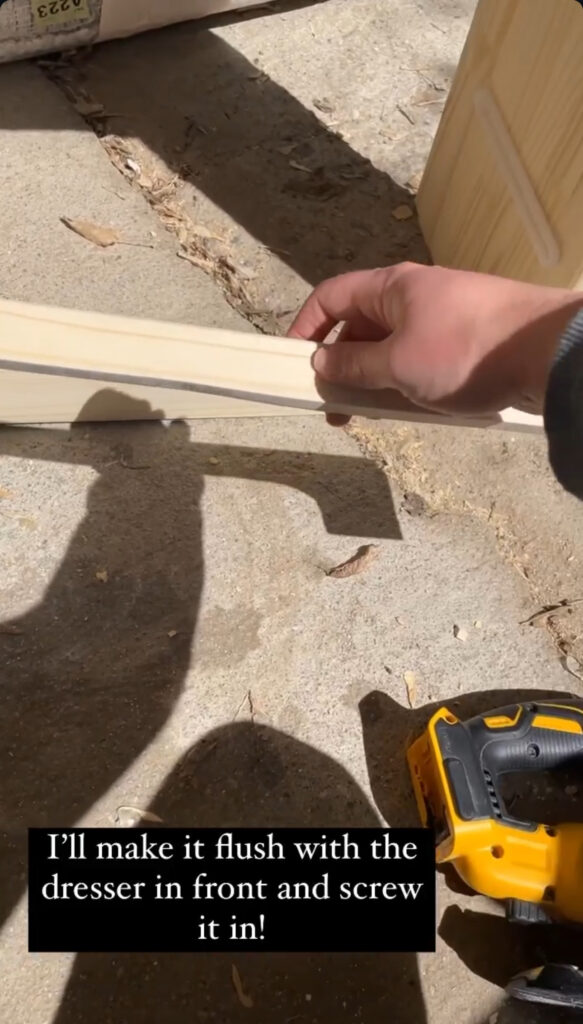 I wanted to give the nightstand a little extra personality, so I designed a simple decorative cutout for the bottom front panel. Using a jigsaw, I carefully cut the design and sanded the edges for a smooth finish. Once it was ready, I made sure the piece was flush with the front of the dresser and screwed it in place.
