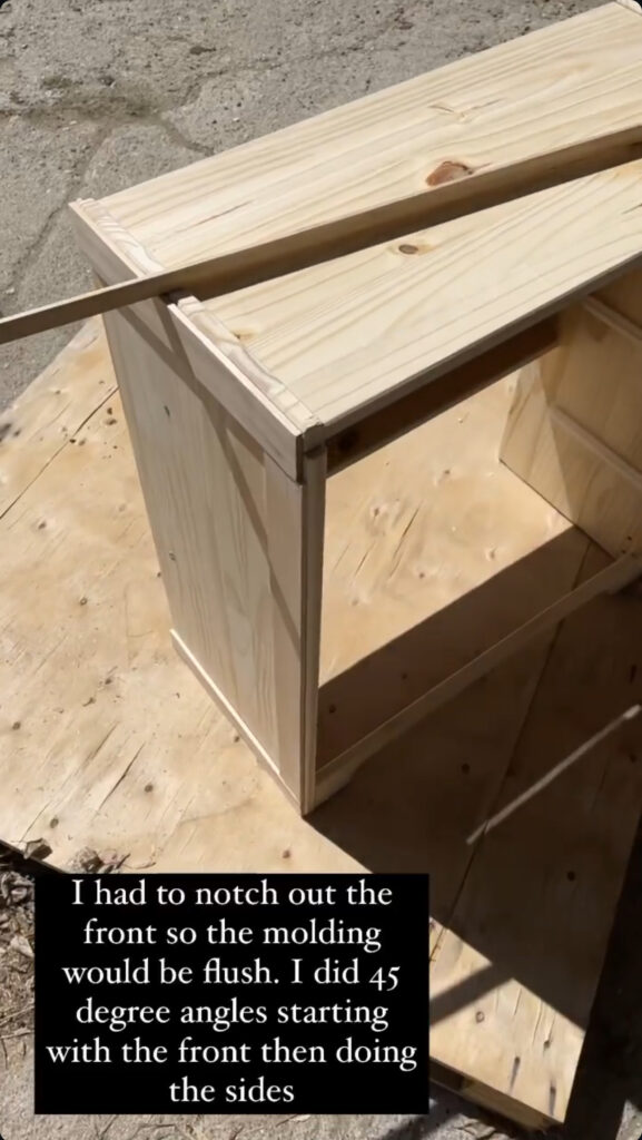 To take it a step further, I added lattice trim along the outer edges of the dresser as well. Again, I used wood glue and 3/4″ Brad nails to secure the trim in place. I had to notch out the front corners so the molding would sit flush against the frame—this involved cutting 45-degree angles, starting at the front and working my way to the sides using a miter saw. This little step makes a huge difference in the overall finish.