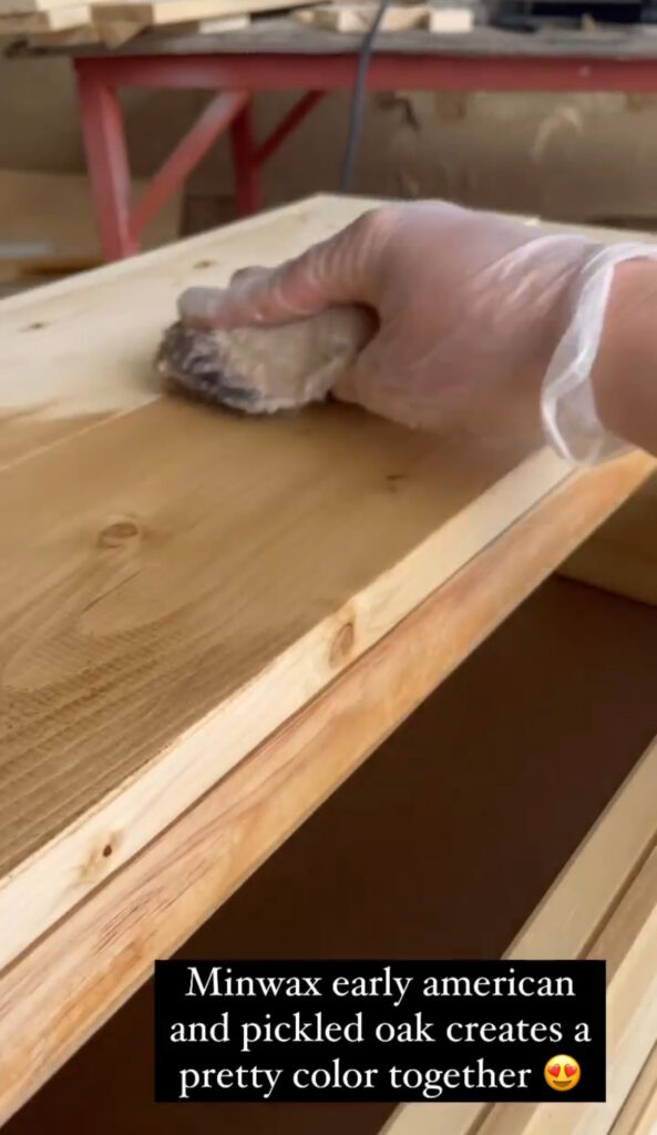 I started with an oil-based wood conditioner to help the stain absorb evenly and prevent blotching. After letting it sit according to the instructions, I applied a custom stain combo: Minwax Early American layered with Pickled Oak. This combination gave the wood a soft, warm tone with a slightly weathered finish—it’s seriously gorgeous.