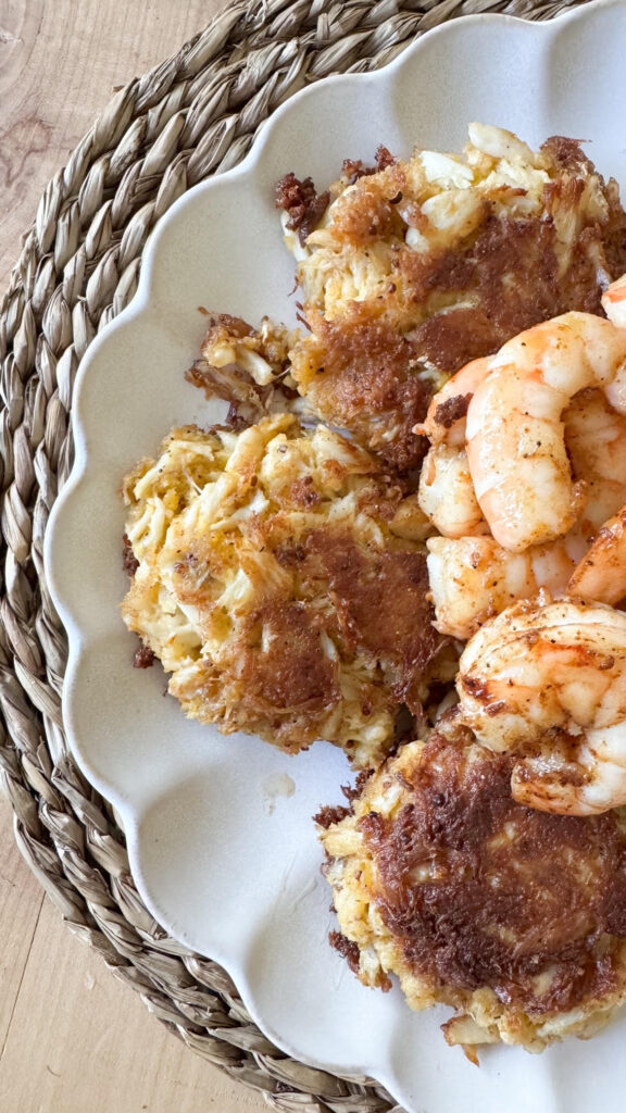 I like to let the crab cakes rest in the refrigerator for up to an hour before cooking. Pull from the fridge and there’s a few ways to cook these, Pan fry for 5 minutes per side with a little avocado oil, bake at 375°F for 12-15 minutes until evenly browned on each side or my favorite way, grill them! I grill them on my griddle or you can use some tin foil so they don’t fall through the grates and cook evenly on each side for 10-12 minutes.