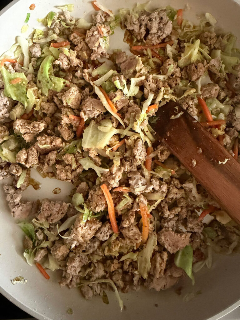 Using a bag of coleslaw mix is a huge time saver since it already contains shredded cabbage and carrots. It gives the dish that classic egg roll flavor without needing to chop multiple vegetables.