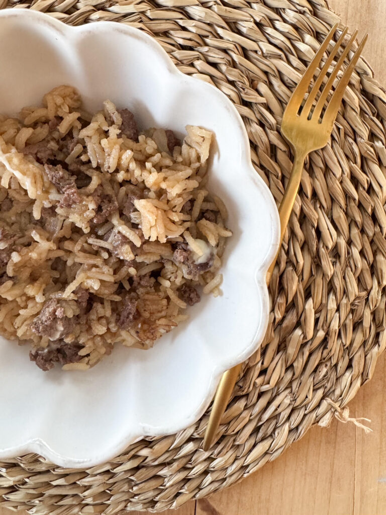 Preheat oven to 350°. While the oven is heating start by adding a stick of butter to an oven safe pan and then add in your sliced onions. Cook them until they are soft and browning. Remove and add in your ground beef, cooking until brown. Add the onions back in and mix well. Sprinkle on the uncooked rice evenly over top of the ground beef. Mix the spices with the beef broth and pour that over top.