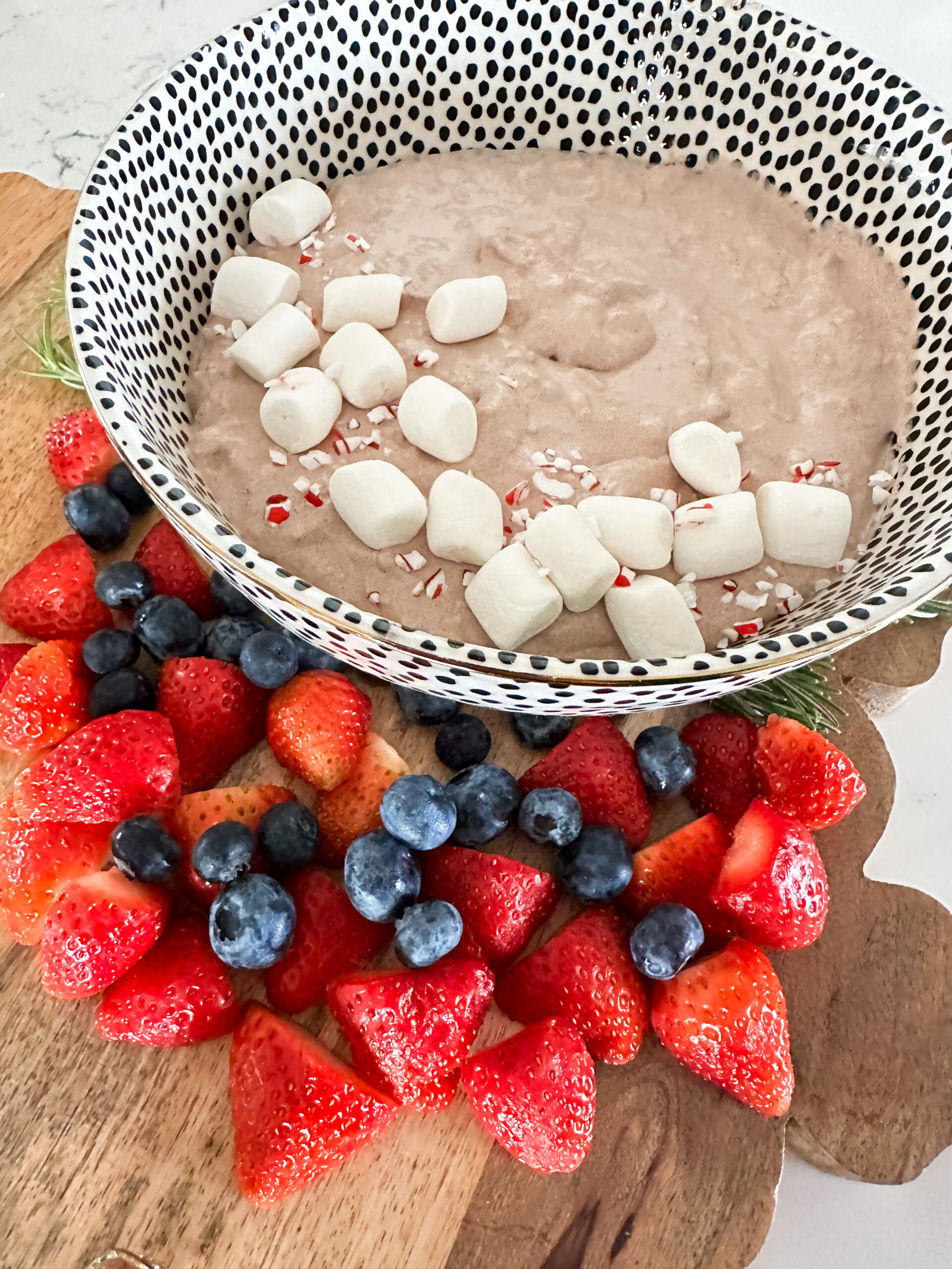 This dip is SO quick and easy to make! Only 3 ingredients and like 3 minutes to whip up! This is SO good with any kind of cookie or fruit! My toddler LOVES to dip fruit in this, and its such a fun holiday treat!
