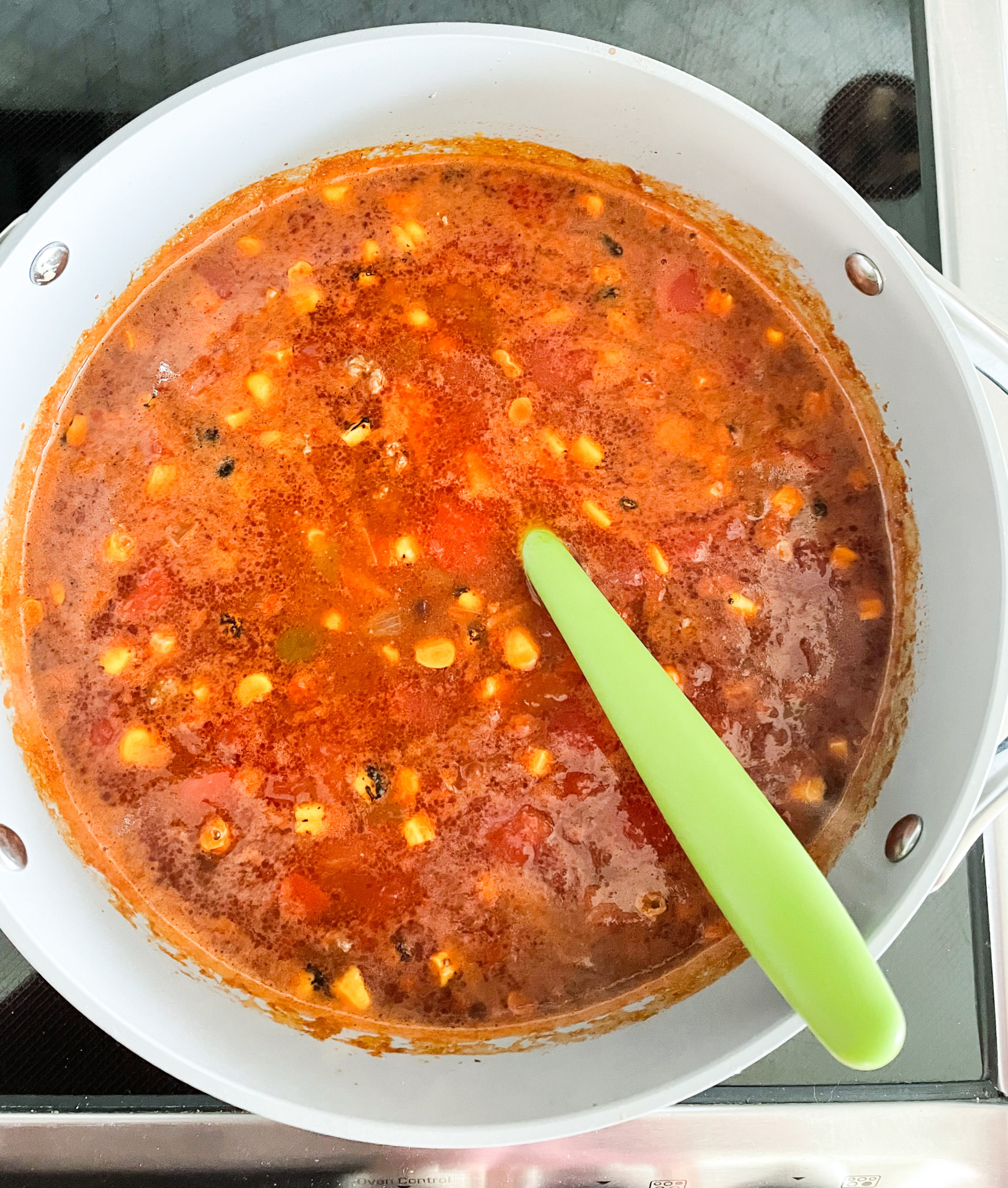 - Start but adding the ground beef or chicken to a pot with the onion, pepper and taco seasoning. Let simmer until cooked. Add in the remainder ingredients.
