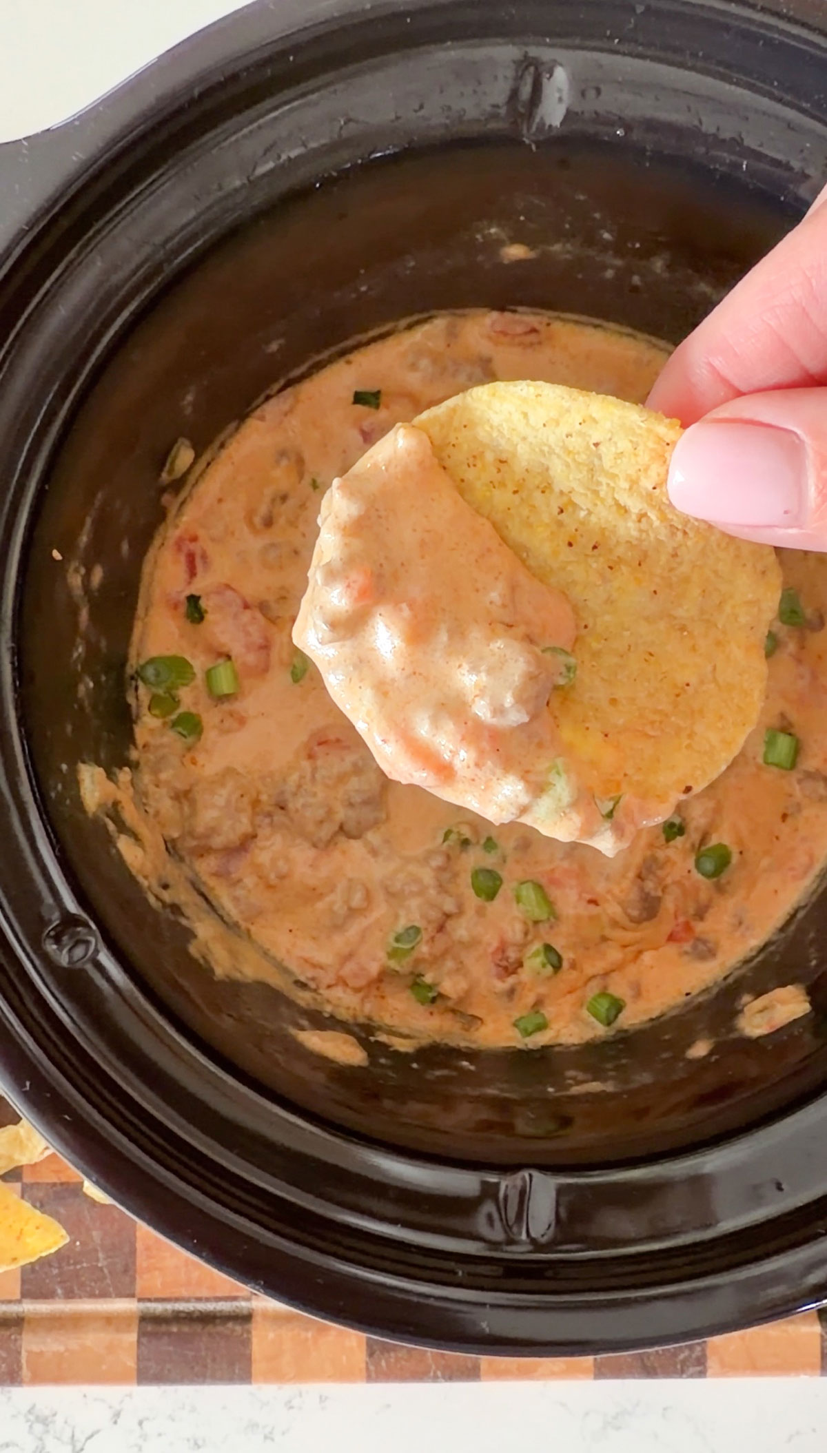 Top with green onions and serve warm with tortilla chips or corn chips.