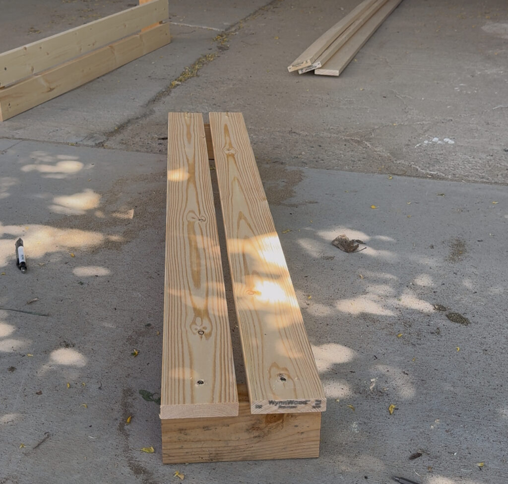Next, you’ll create the seating panels that fold open and closed. For each side, lay out 4 planks (1/2″ apart) and attach them to two 2 x 4 armrests (7 1/2″ each). The 2 x 4s should be inset at least 1″ from the edge so they fit neatly inside the box when folded down. You’ll make two of these panels.