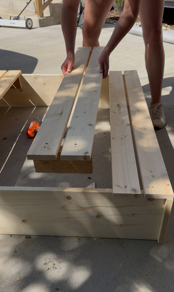 Next, you'll create the seating panels that fold open and closed. For each side, lay out 4 planks (1/2" apart) and attach them to two 2 x 4 armrests (7 1/2" each). The 2 x 4s should be inset at least 1" from the edge so they fit neatly inside the box when folded down. You’ll make two of these panels.