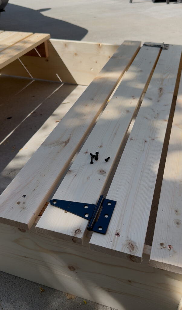Position the seat panels next to the two fixed planks already attached to the box. Leave a 1/2″ gap between them. Attach the hinges to connect the fixed planks and the foldable seat panels. Once all four hinges are installed, carefully flip the entire sandbox over to make sure the hinges are secure and aligned.