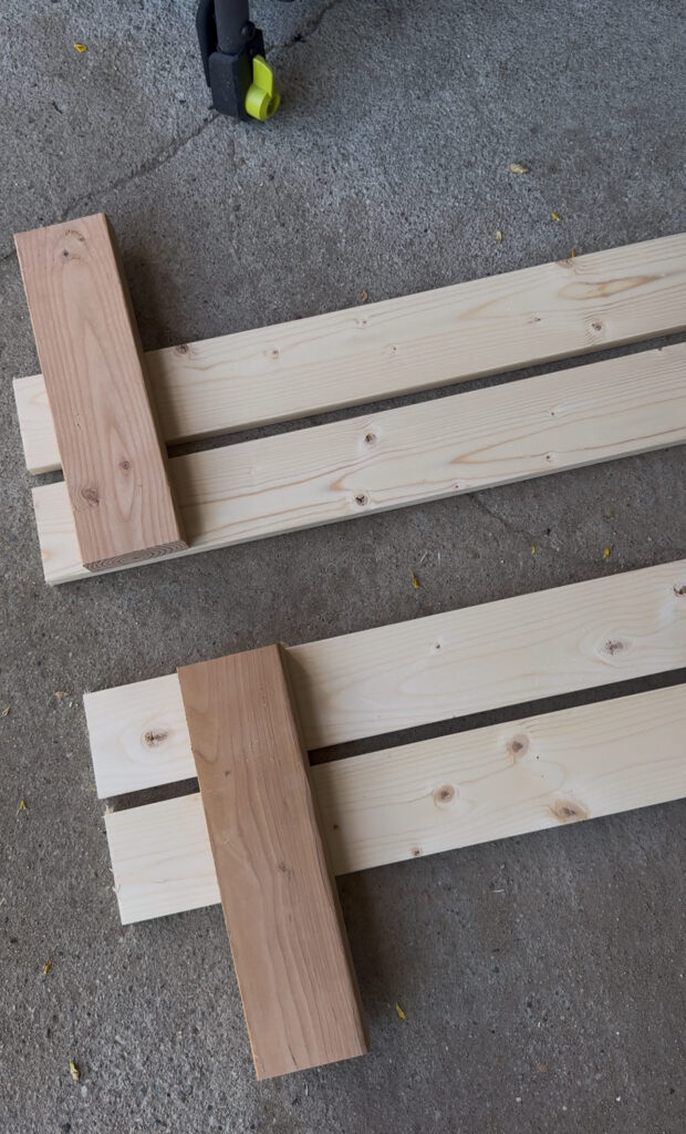 To make the seat backs, line up four more 1 x 4 planks (again spaced 1/2″ apart) and attach two 12 1/2″ 2 x 4s to the back, about 4″ from each end. Repeat this step to make the second backrest.
