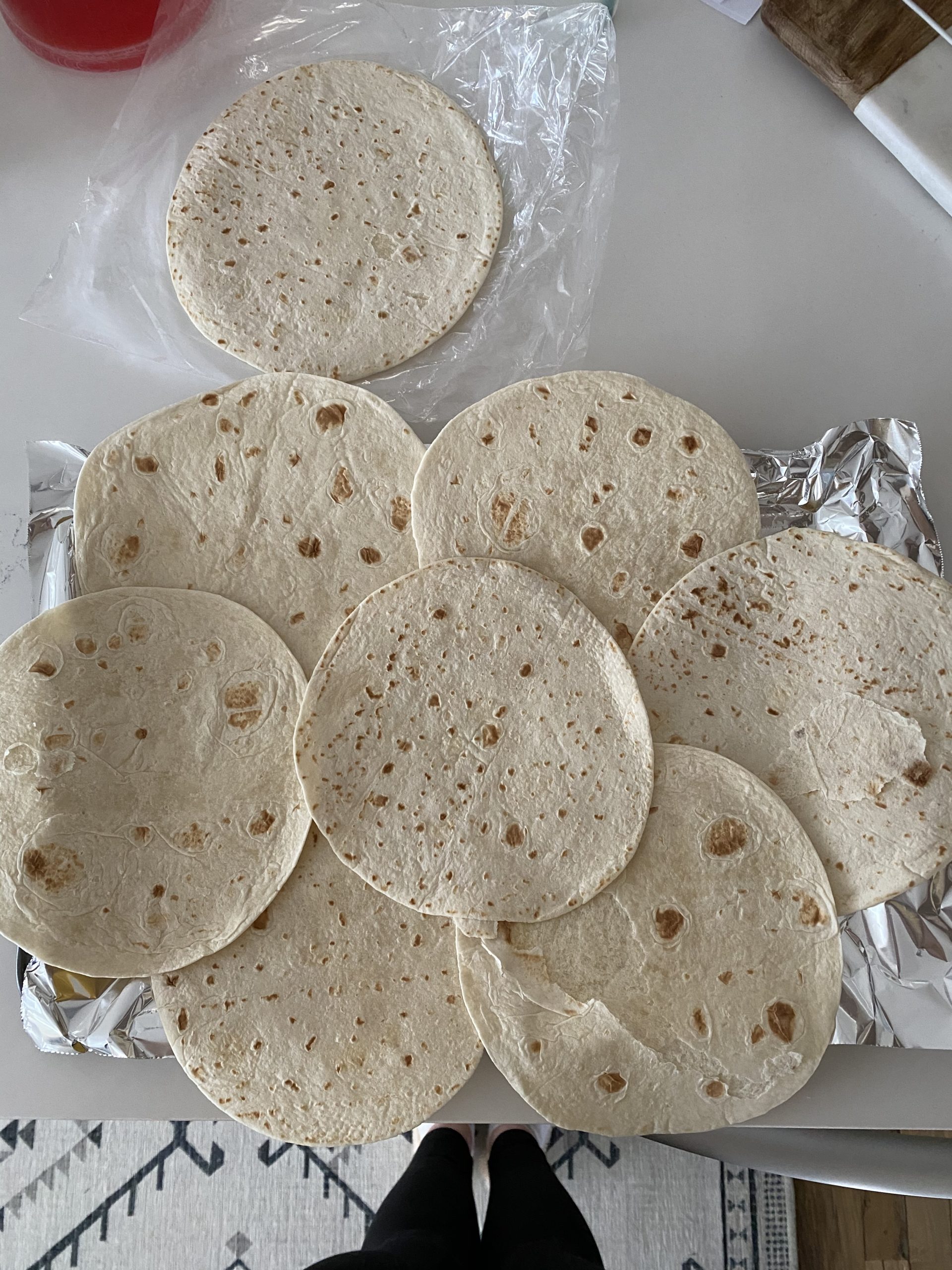 - Preheat oven to 350. Place 6 of the flour tortillas around the edges of the lightly sprayed sheet pan. Make sure the tortillas overlap and are hanging halfway over the edge of the pan, leaving a gap in the center. Then, place 1 tortilla over the bottom center gap of the sheet pan. See example picture below.