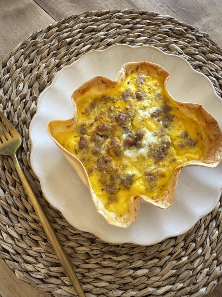 Preheat your oven to 350°. In a small oven safe bowl add your flower tortilla, crack your two eggs at your cottage cheese and your breakfast sausage.