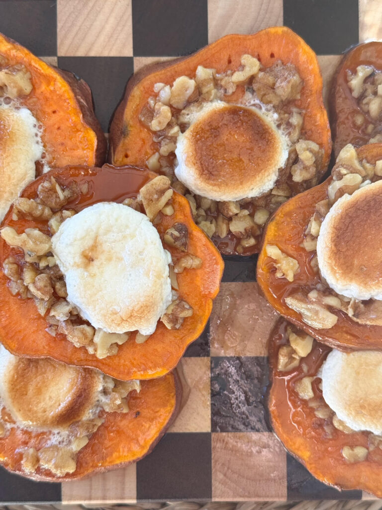 Add 5 or 6 mini marshmallows on top of the brown sugar pecan mixture or cut a big marshmallow in half and place the halves on top. Return to the oven until marshmallows are melted. This takes about 3-4 minutes and then I broil for 30 seconds.