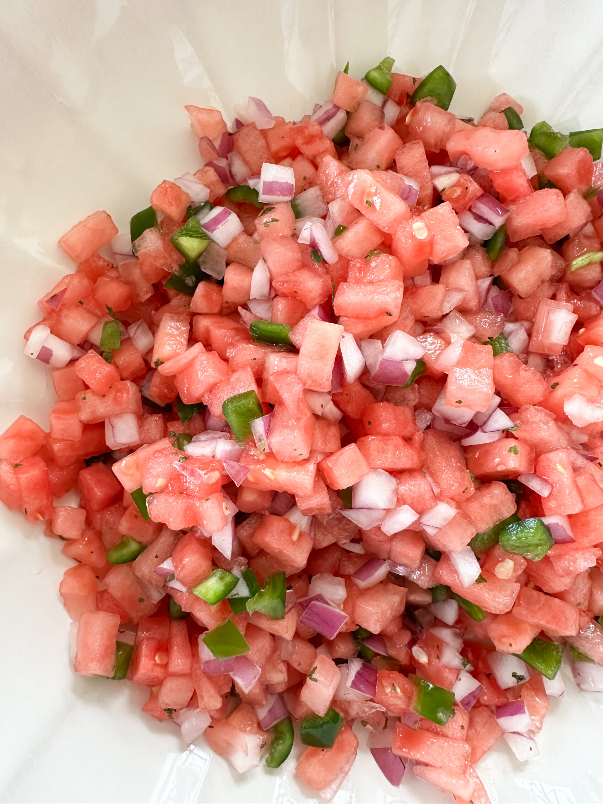 - Chop up the watermelon, jalapeno and red onion. Add in the lime juice, agave nectar, cilantro and salt and mix well.